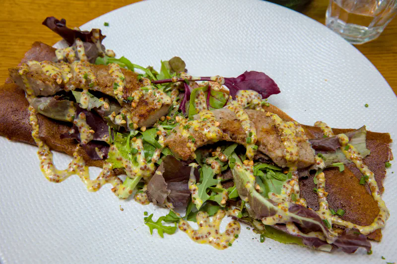 Saucisse au couteau, Comté, Confit d’oignons, Mesclun, Crème de moutarde à l’ancienne, Graines de sarrasin grillées & Miel