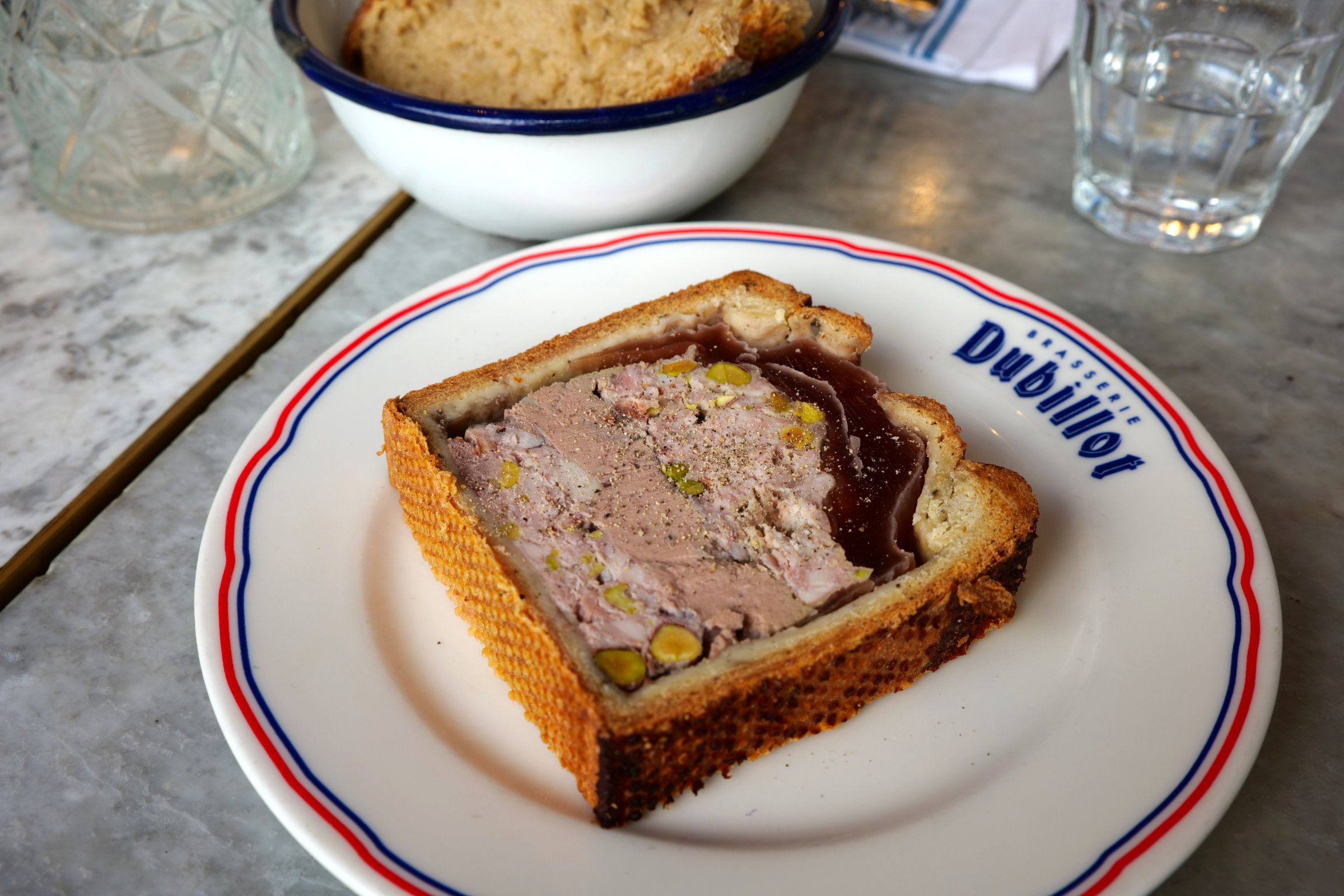 Pâte bien beurrée de la pâtissière, farce cochon et pistache, insert mousse de foie de volaille