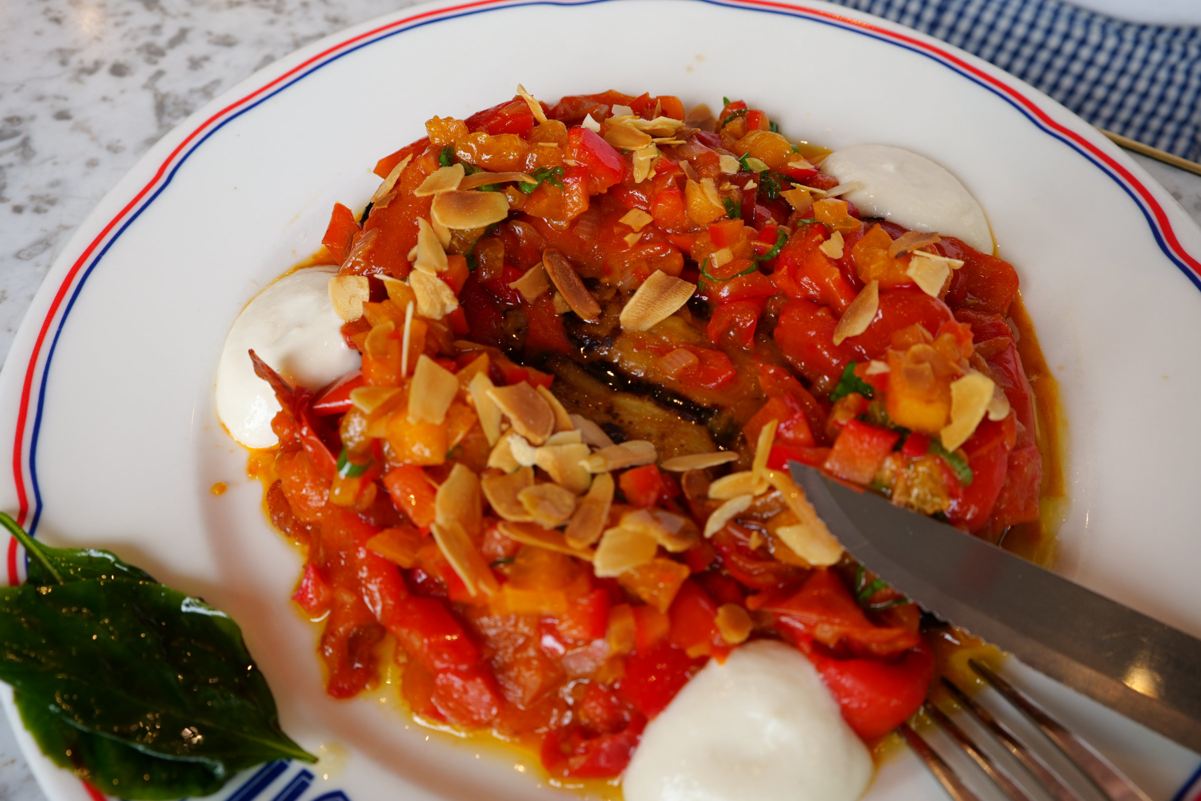 Aubergine laquée et grillée au barbecue, piperade de poivrons rouges et de tomates Datterino, tartare d’abricots, crème d’ail et amandes effilées